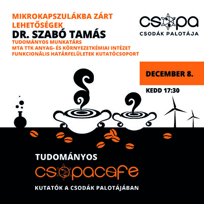 Tudománynépszerűsítő programsorozat keretében december 8-án Dr. Szabó Tamás, az MTA TTK Anyag- és Környezetkémiai Intézet Funkcionális Határfelületek Kutatócsoport tudományos munkatársa „Mikrokapszulákba zárt lehetőségek” címmel tart előadást a Tudományos Csopa Cafe rendezvényén 17.30-tól.